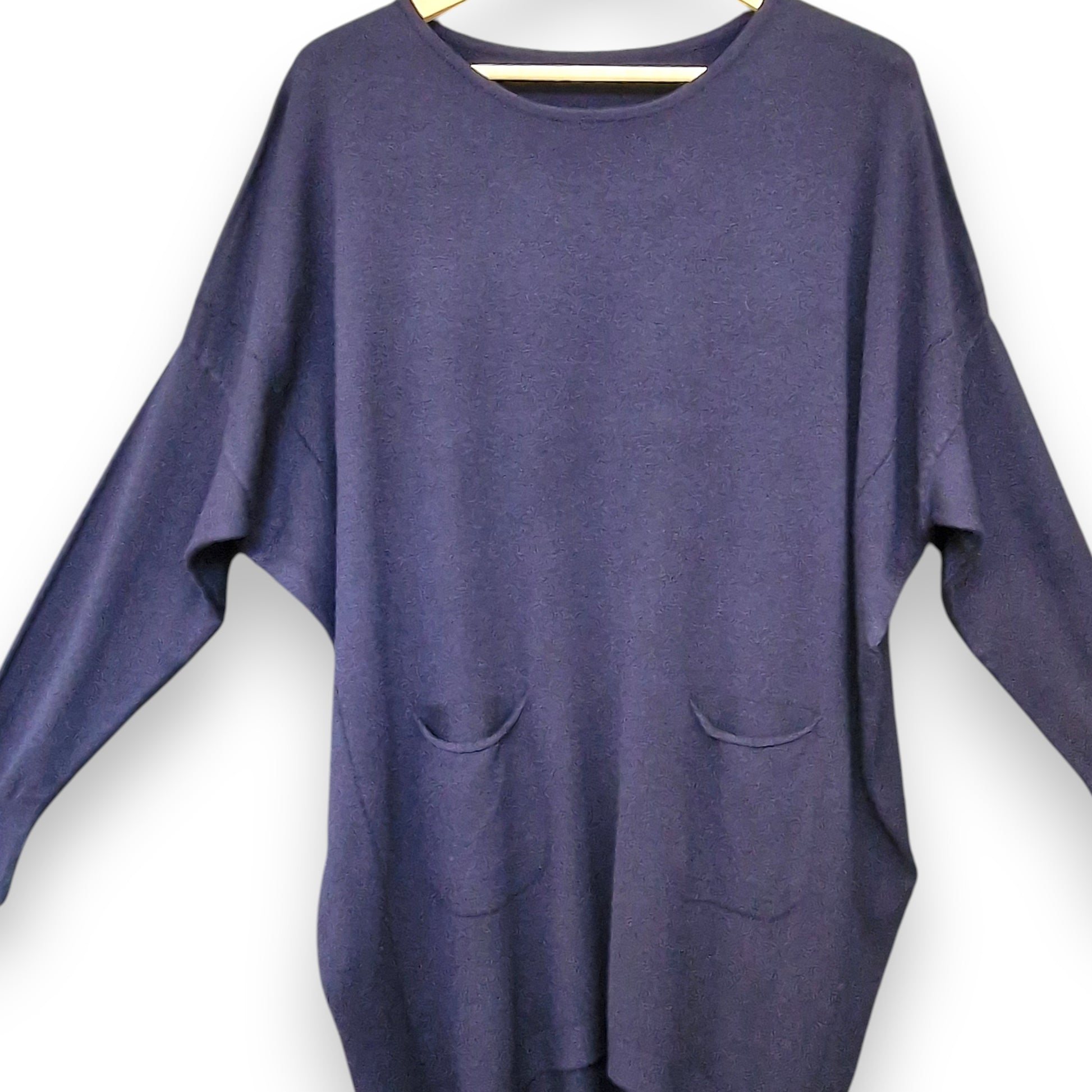 Il modello Felicity è una Maxi Maglia Taglia Grande Manica Manica Pipistrello in tessuto elasticizzato di misto viscosa e modal effetto lana. Girocollo con orlo asimmetrico più lungo dietro . Tasche a toppa davanti, Grande vestibilità, Questo modello è perfetto per le giornate di lavoro o serate informali con le amiche