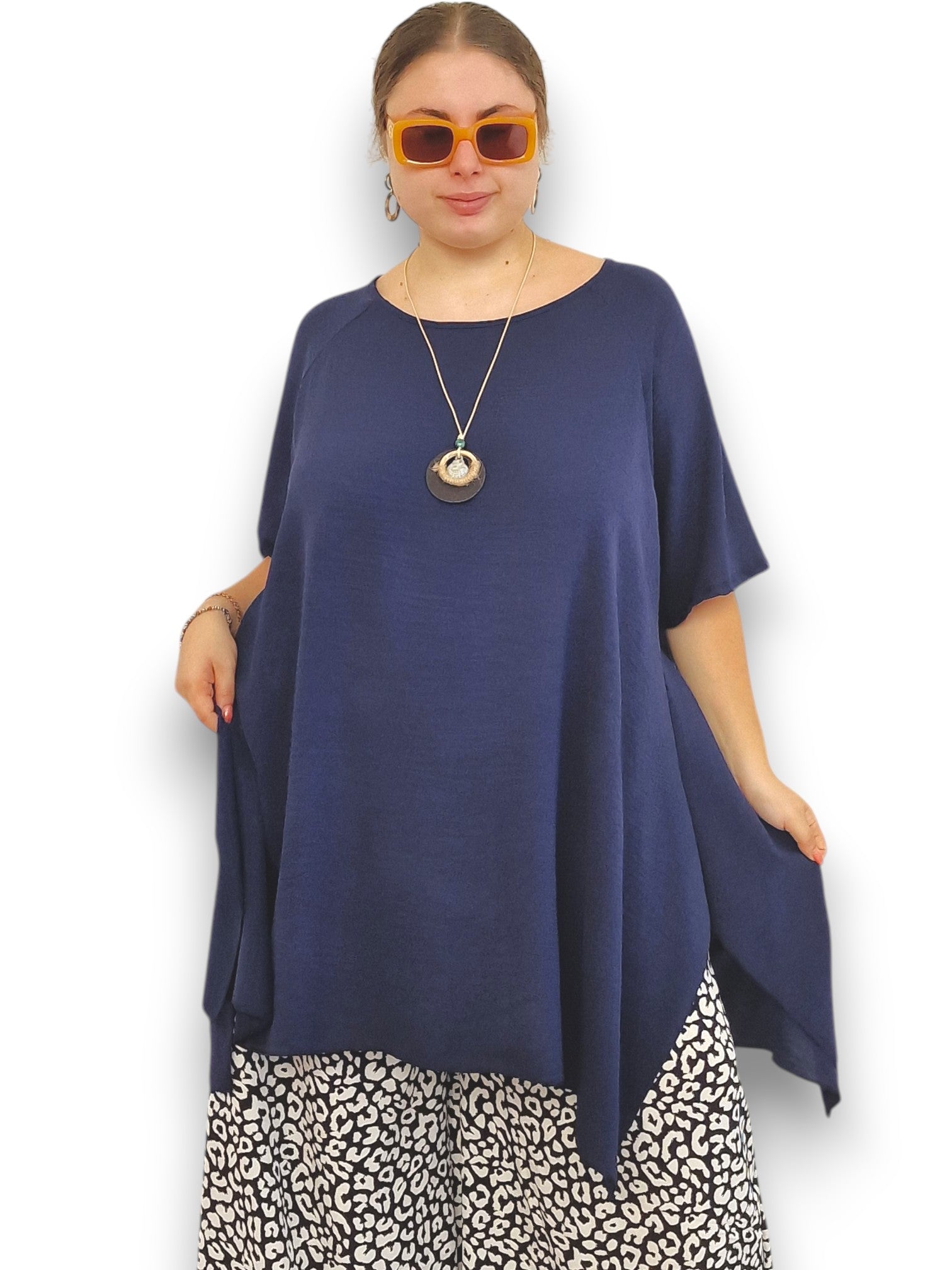 Il modello Giusy è una Maxi Maglia con Collana manica corta in tessuto fermo di misto viscosa. Ampio girocollo con manica Raglan e grandi spacchi laterali.