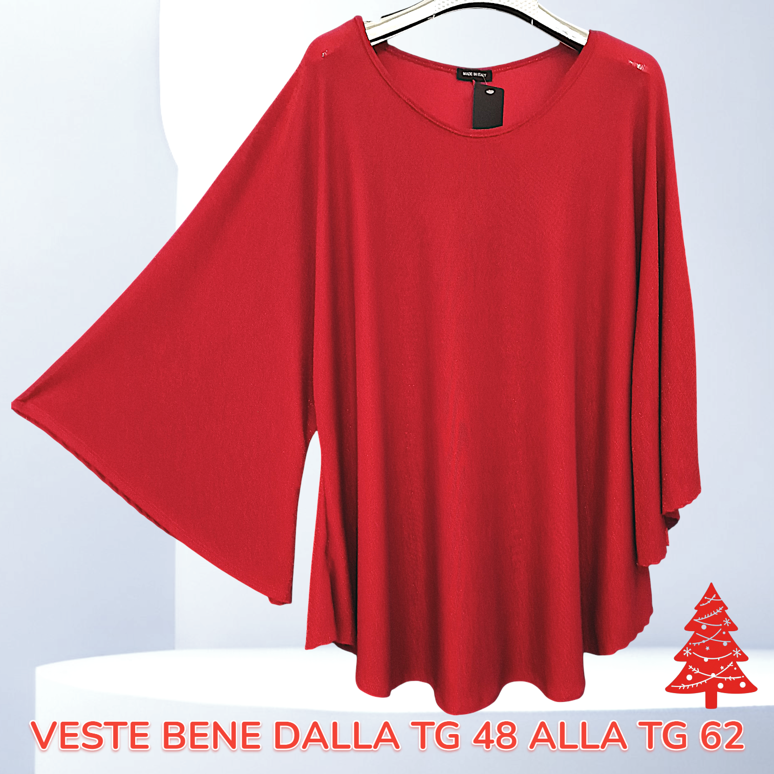 Il modello Tecla è una maglia con manica a campana e orlo stondato in maglina di misto viscosa elasticizzata in lurex per un look speciale e raffinato. Questa Maglia offre una grandissima vestibilità, grazie al suo tessuto elasticizzato ed è perfetta per le donne che vestono le taglie più grandi anche nelle occasioni più eleganti.