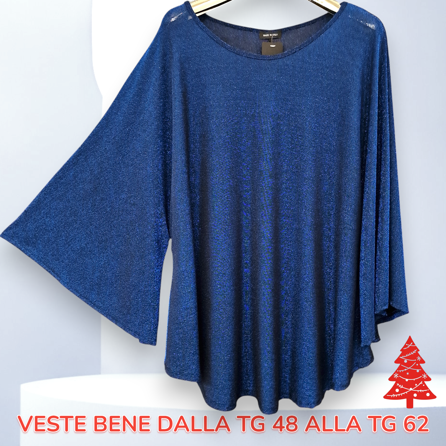 Il modello Titti è una maglia con manica a campana e orlo stondato in maglina di misto viscosa elasticizzata in lurex per un look speciale e raffinato. Questa Maglia offre una grandissima vestibilità, grazie al suo tessuto elasticizzato ed è perfetta per le donne che vestono le taglie più grandi anche nelle occasioni più eleganti.
