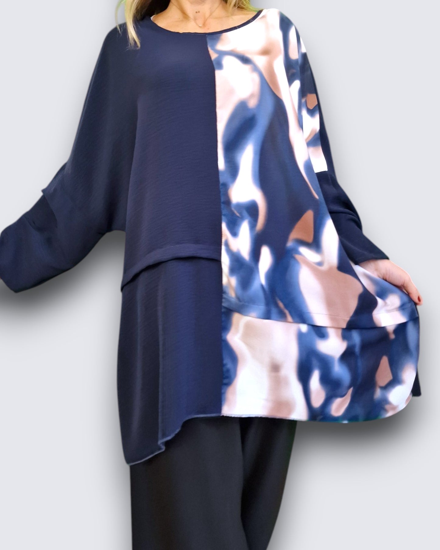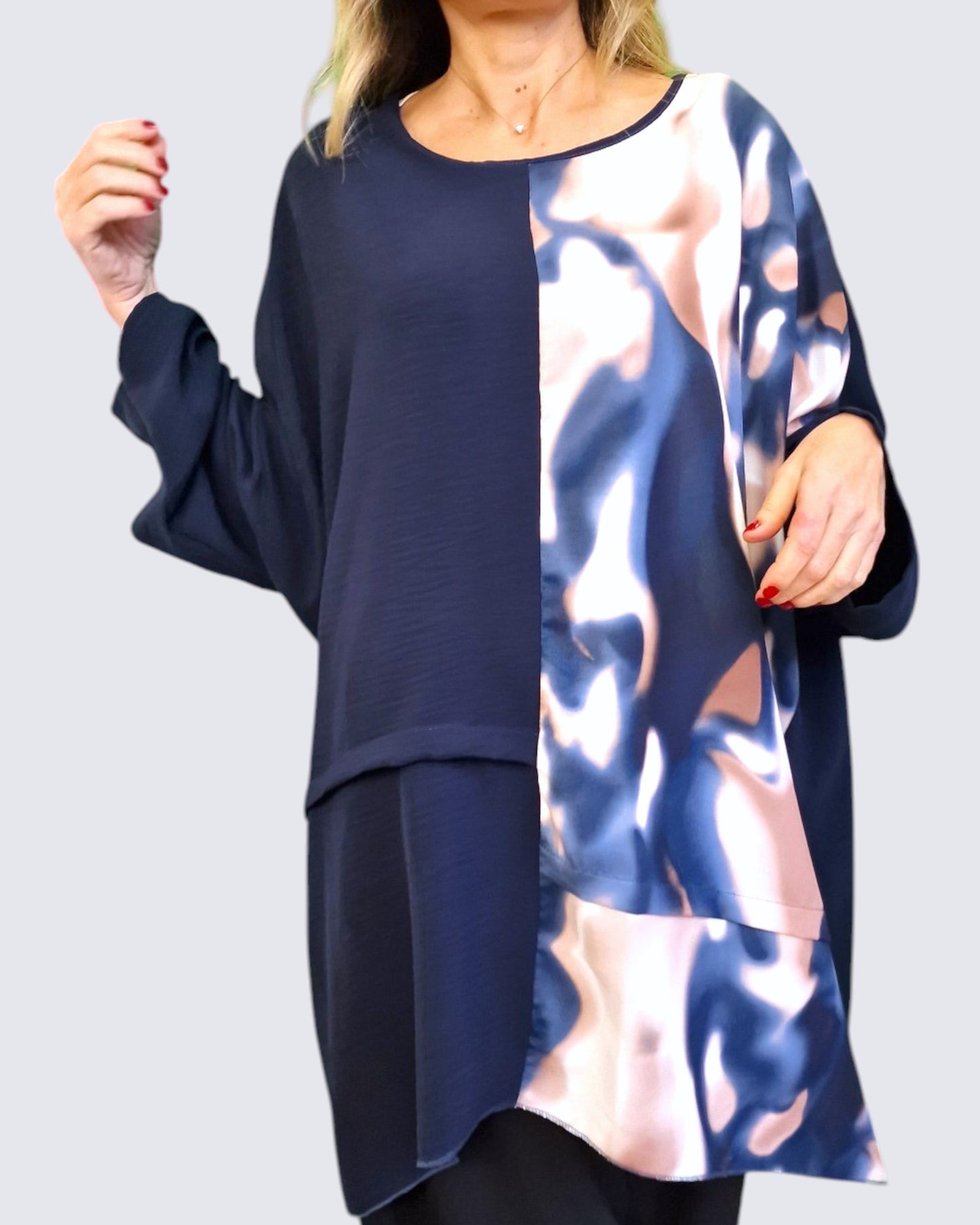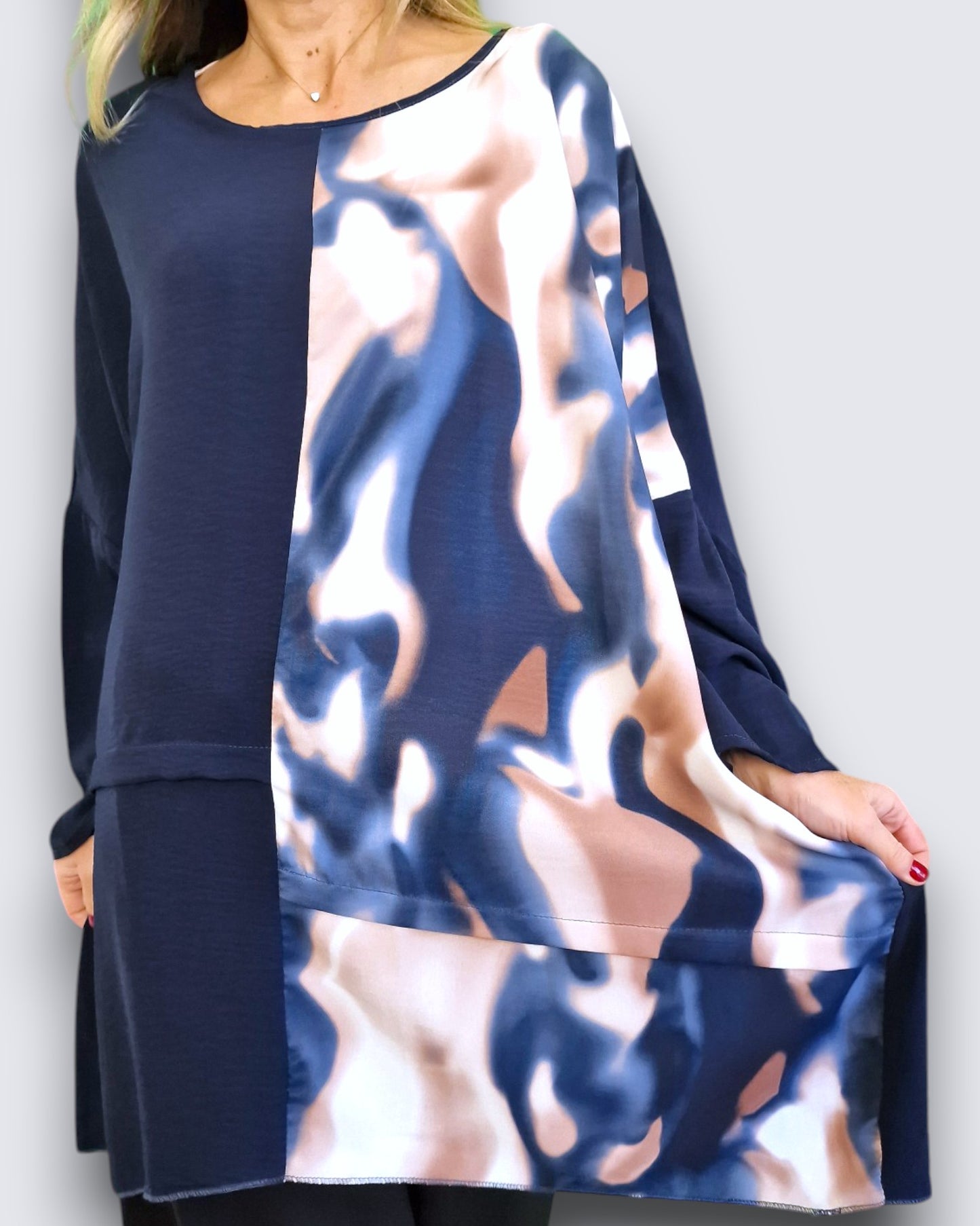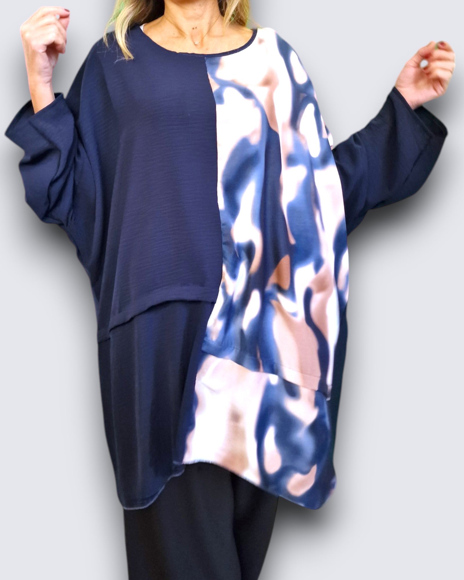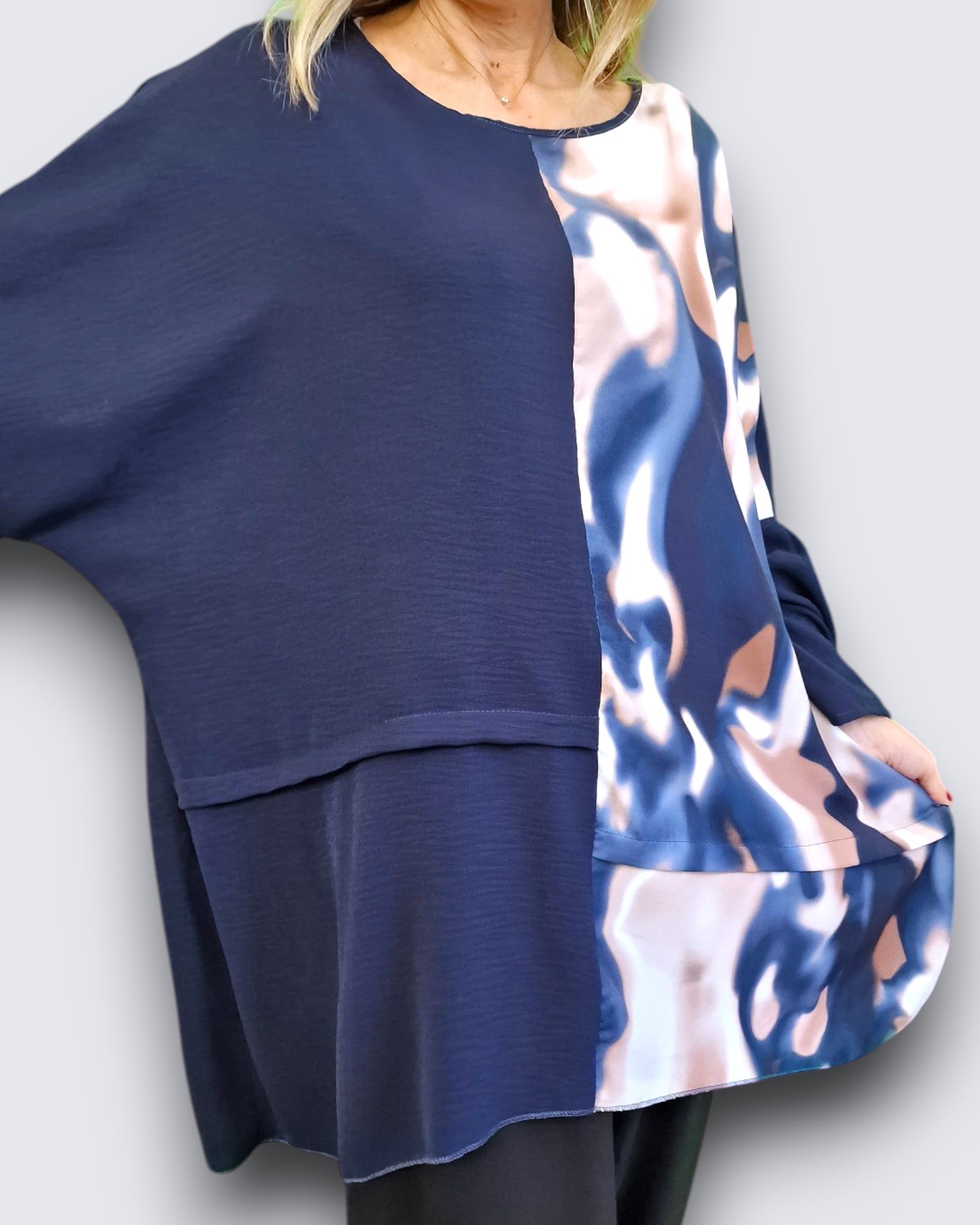 Il modello Rinalda è una maxi maglia con inserti fantasia in tessuto fermo di misto viscosa. Ampio girocollo cucitura a contrasto. Grandissima vestibilità, taglia unica, Made in Italy, colore Blu / Fantasia