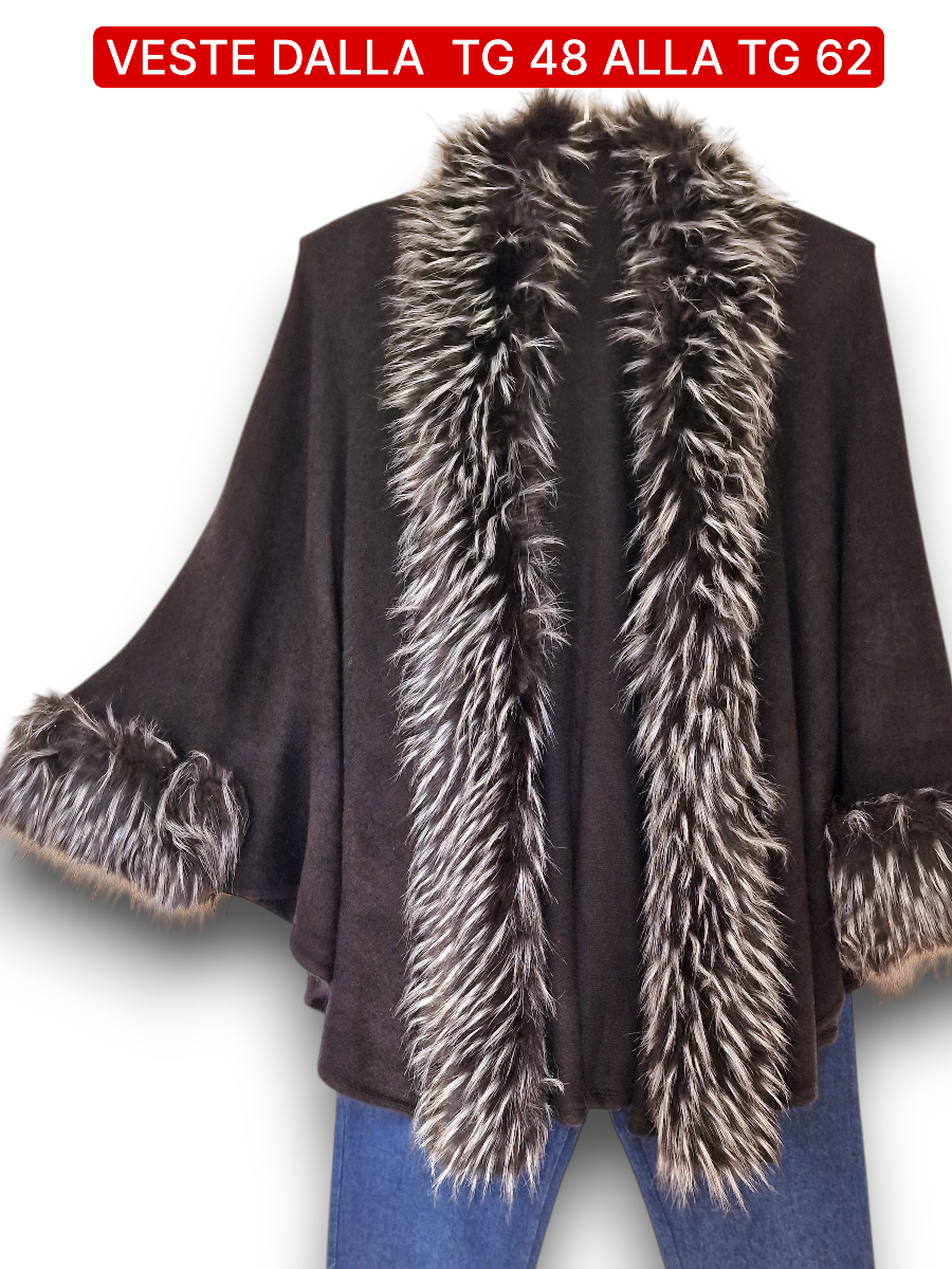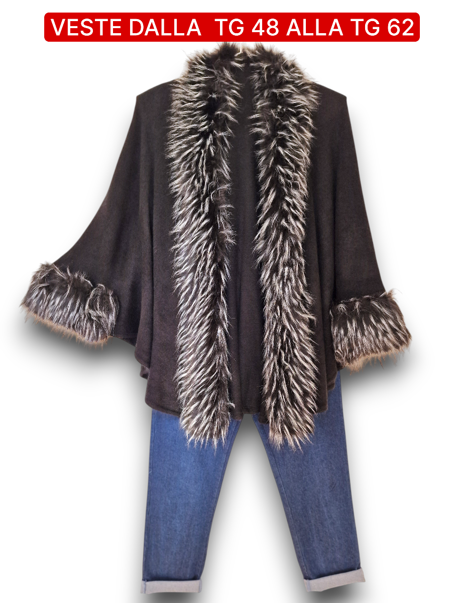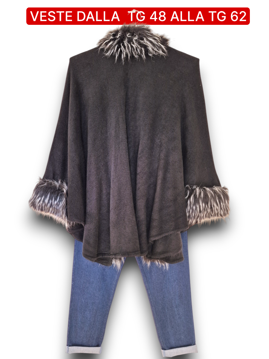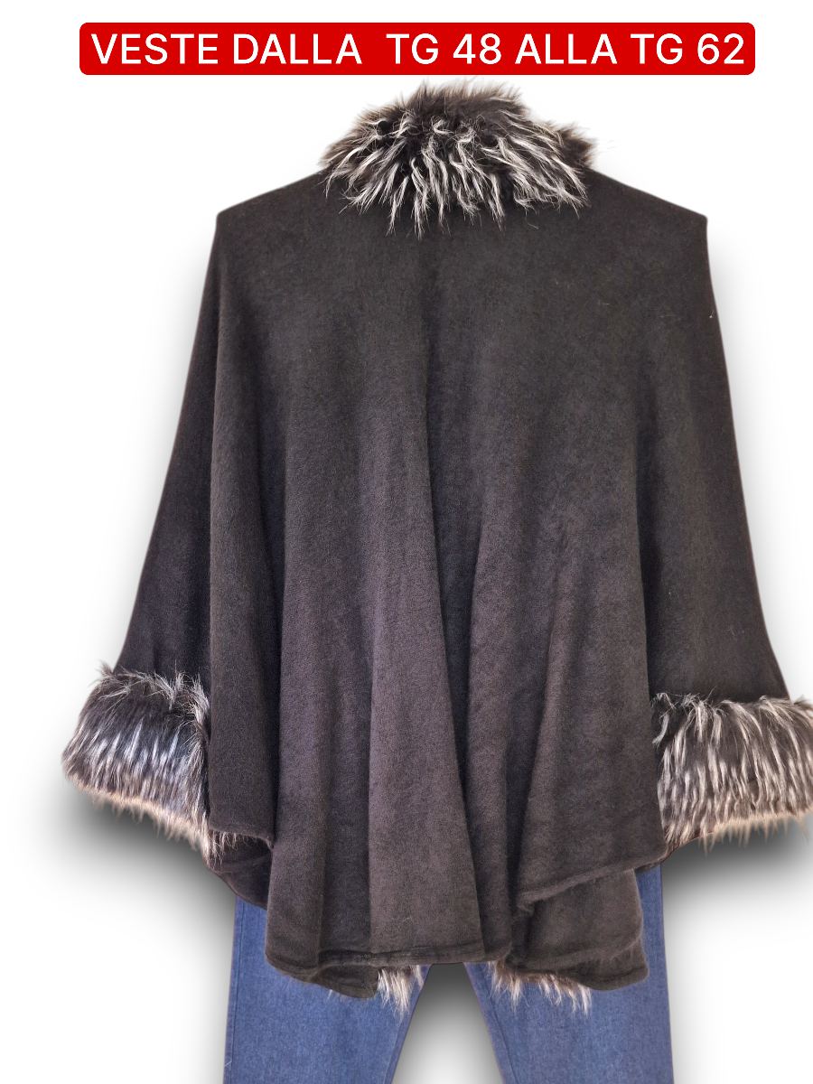 Il modello Lacy è un Maxi Mantella Taglia Grande Manica Pipistrello con applicazione sul collo e polsi in pelliccia ecologica. E' in tessuto elasticizzato di misto viscosa e modal effetto lana. Aperto davanti e sui lati. Grande vestibilità, Questo modello è perfetto per dare un tocco di eleganza al tuo nuovo guardaroba.