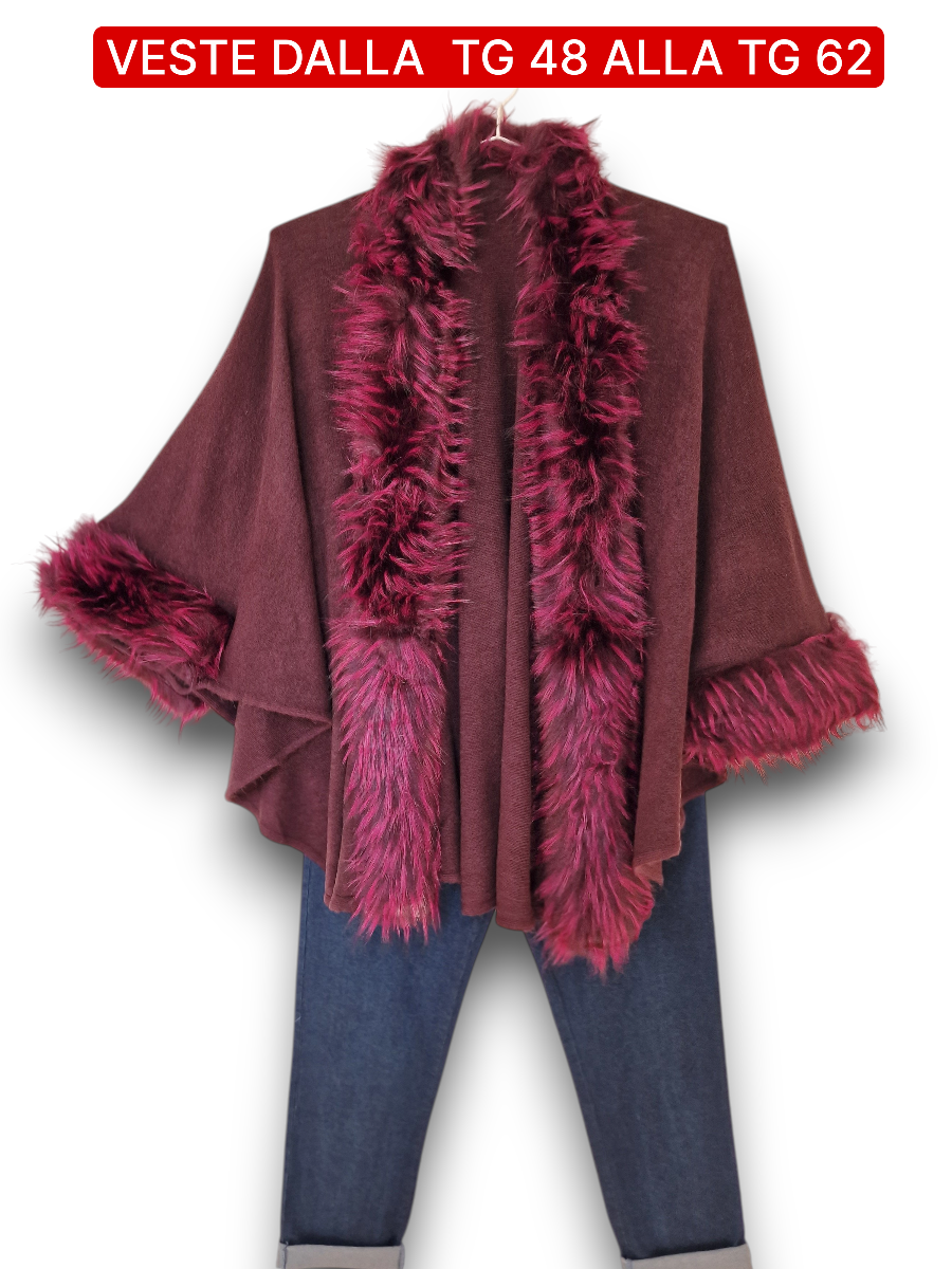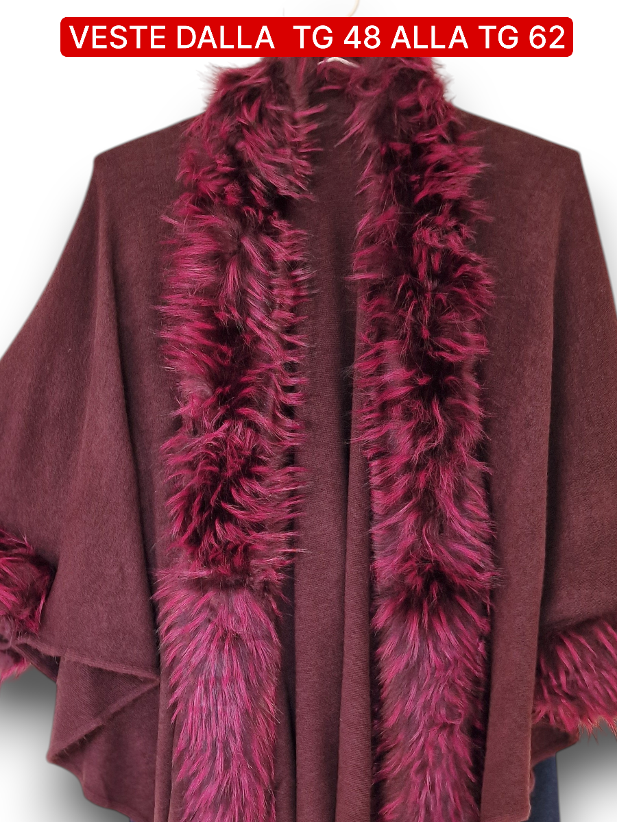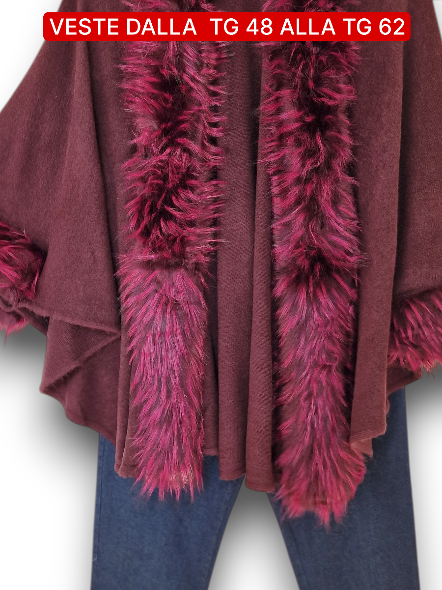 Il modello Lilly è un Maxi Mantella Taglia Grande Manica Pipistrello con applicazione sul collo e polsi in pelliccia ecologica. E' in tessuto elasticizzato di misto viscosa e modal effetto lana. Aperto davanti e sui lati. Grande vestibilità, Questo modello è perfetto per dare un tocco di eleganza al tuo nuovo guardaroba.