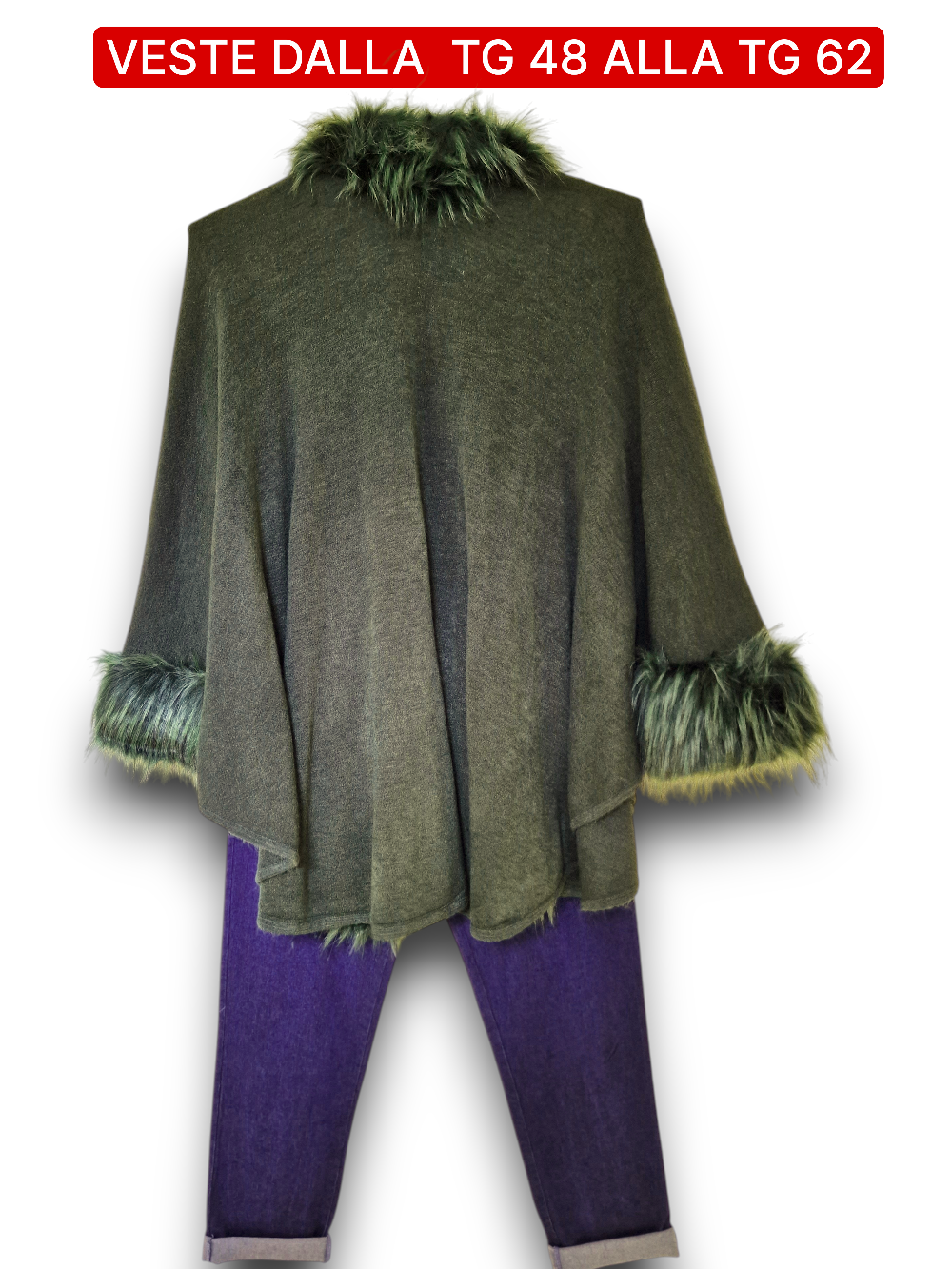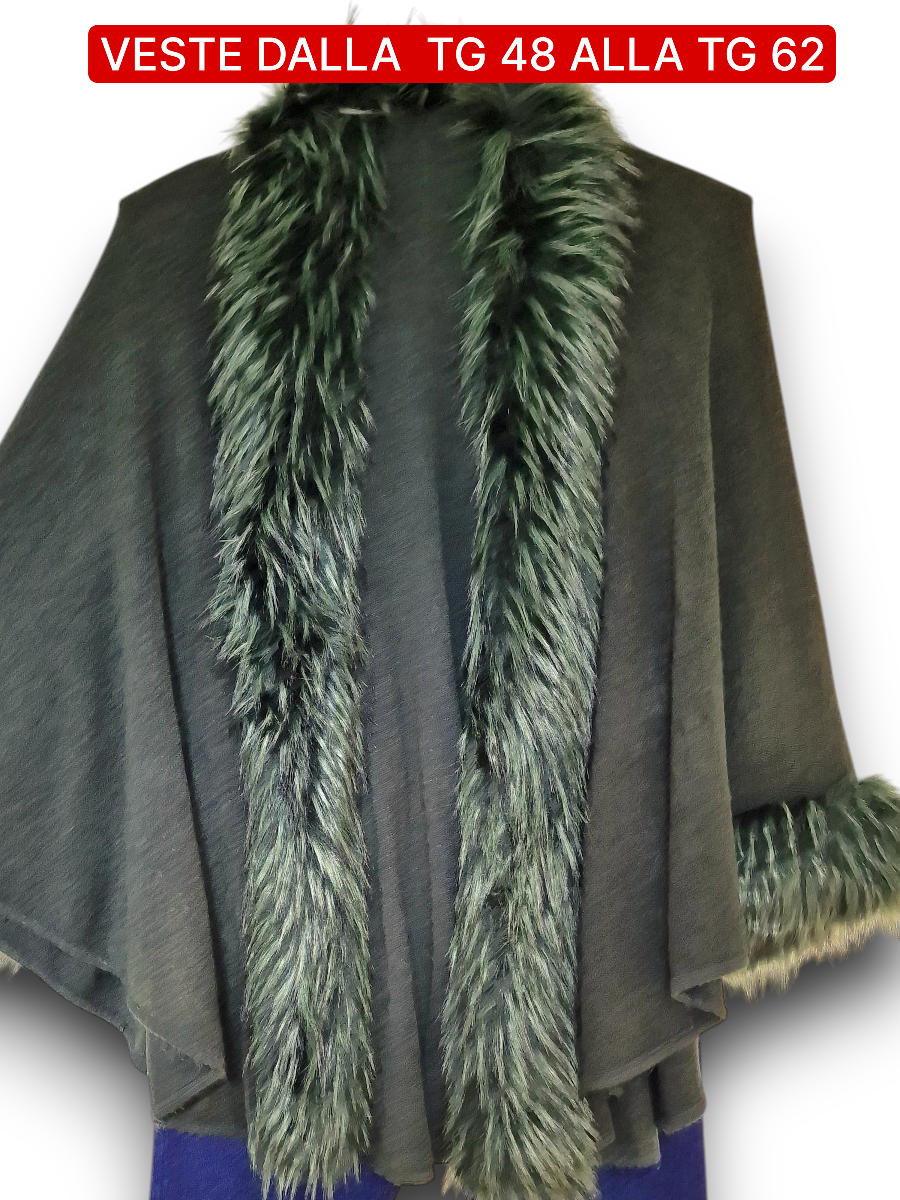 Il modello Lulu è un Maxi Mantella Taglia Grande Manica Pipistrello con applicazione sul collo e polsi in pelliccia ecologica. E' in tessuto elasticizzato di misto viscosa e modal effetto lana. Aperto davanti e sui lati. Grande vestibilità, Questo modello è perfetto per dare un tocco di eleganza al tuo nuovo guardaroba.