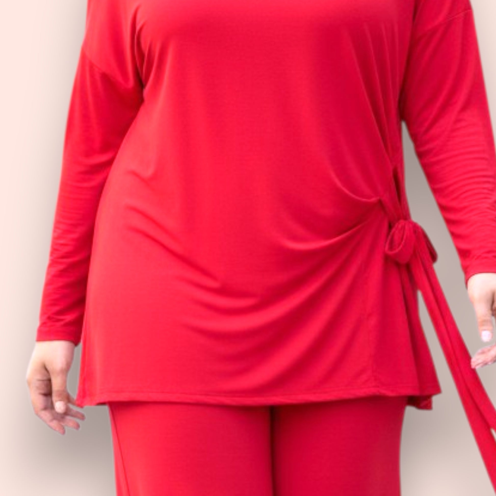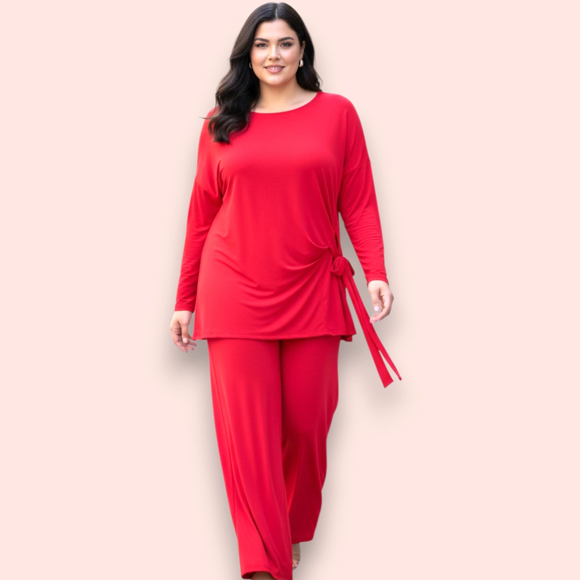 Il completo Gale è composto da una Maxi Maglia in crepe di misto viscosa girocollo con fusciacca sul fianco e il pantalone a palazzo con elastico in vita dello stesso tessuto e colore . Il suo abbinamento ed il pantalone a palazzo lo rendono un completo elegante e versatile allo stesso tempo .