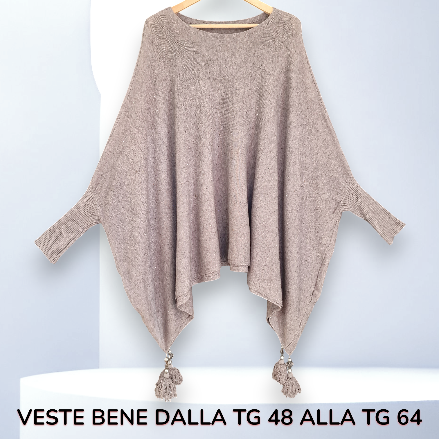 Il modello Giova è un Maxi Poncho Taglia Grande Manica lunga in tessuto elasticizzato di misto viscosa e modal effetto lana. Girocollo con applicazione di Strass Davanti e pendagli in passamaneria di fianco. Manica Pipistrello e manicotti a costina .Grandissima vestibilità, Questo modello è perfetto per chi cerca una maglia più elegante , ma con una grandissima vestibilità. Ottima per le serate più eleganti
