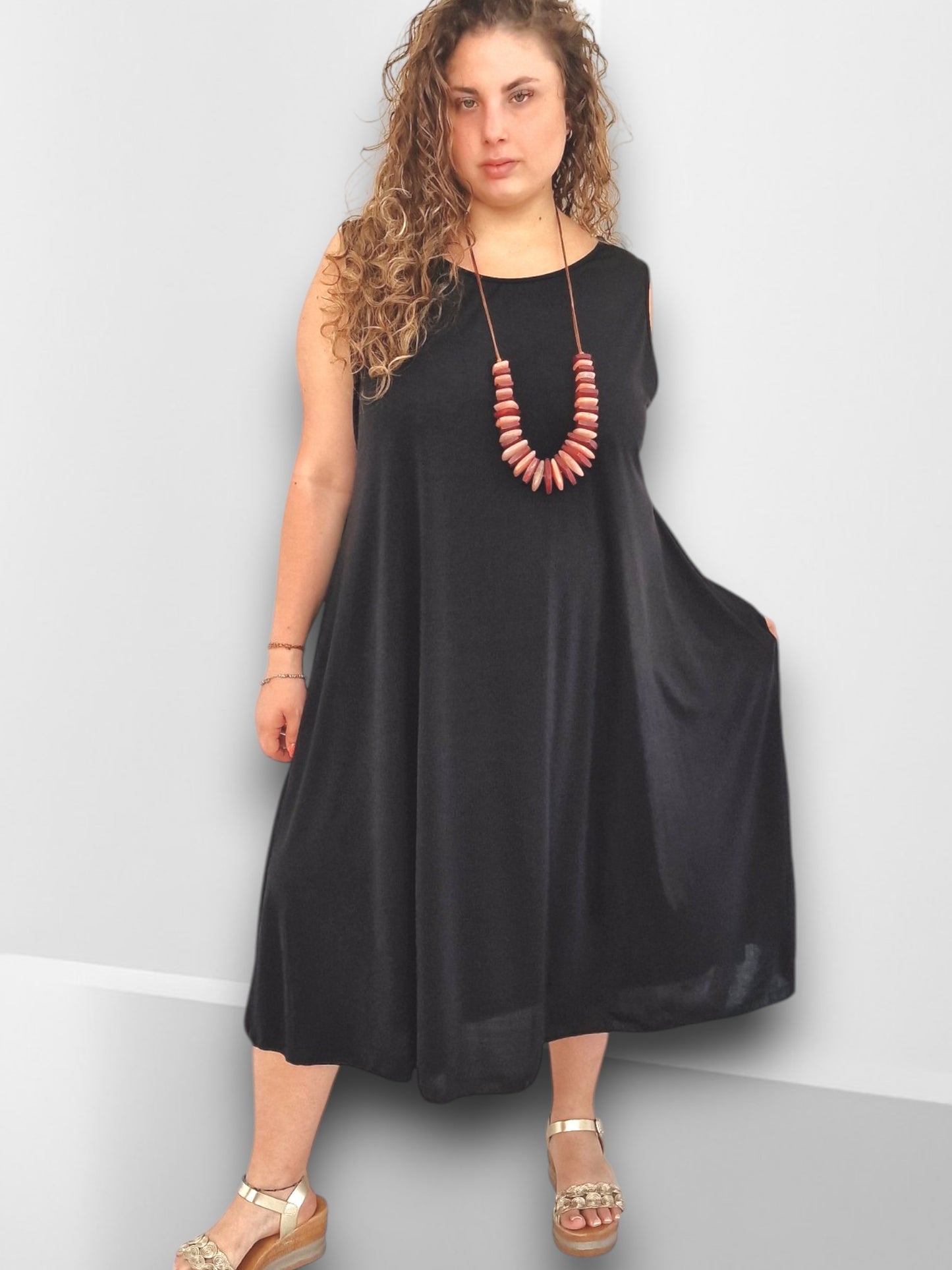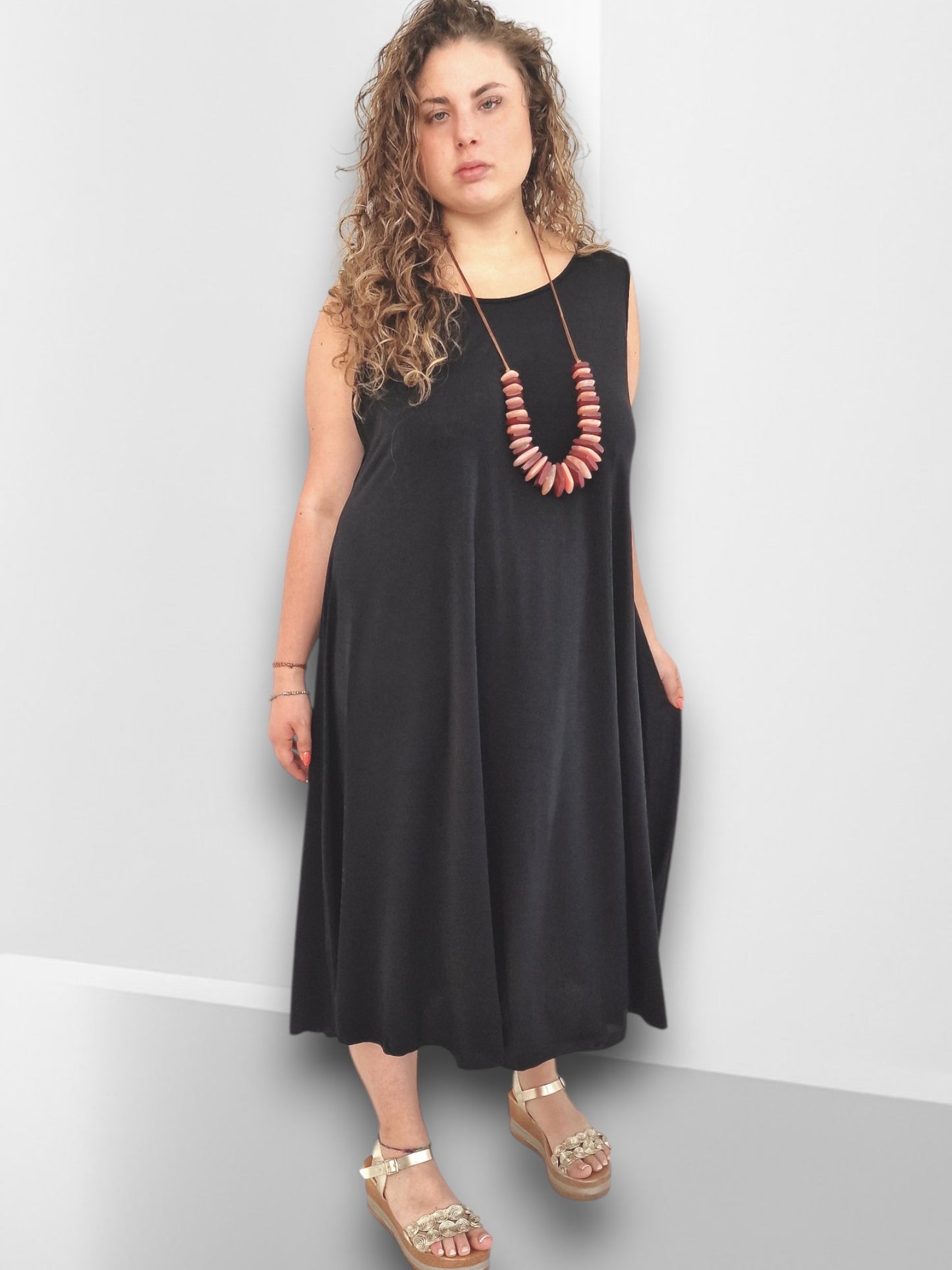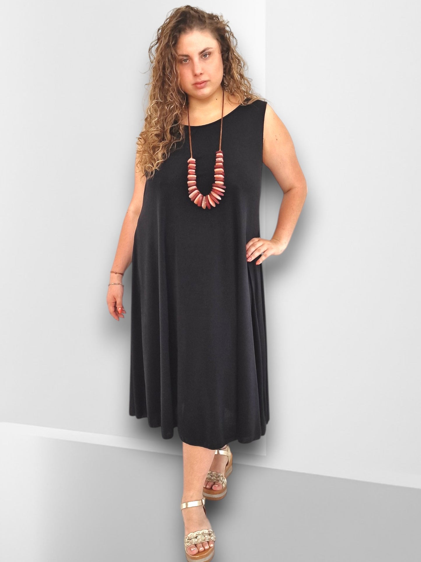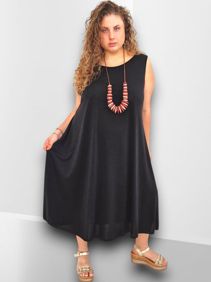 Scopri il Maxi Abito Taglie Forti Evita in crepe di misto viscosa elasticizzata tinta unita . Girocollo senza manica con lunghezza sotto il ginocchio e taglio a trapezio per una grandissima vestibilità,