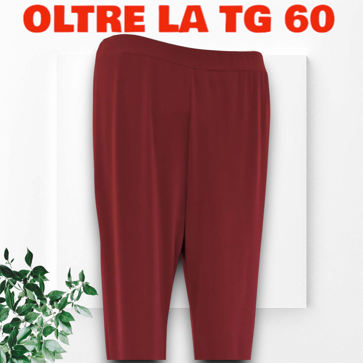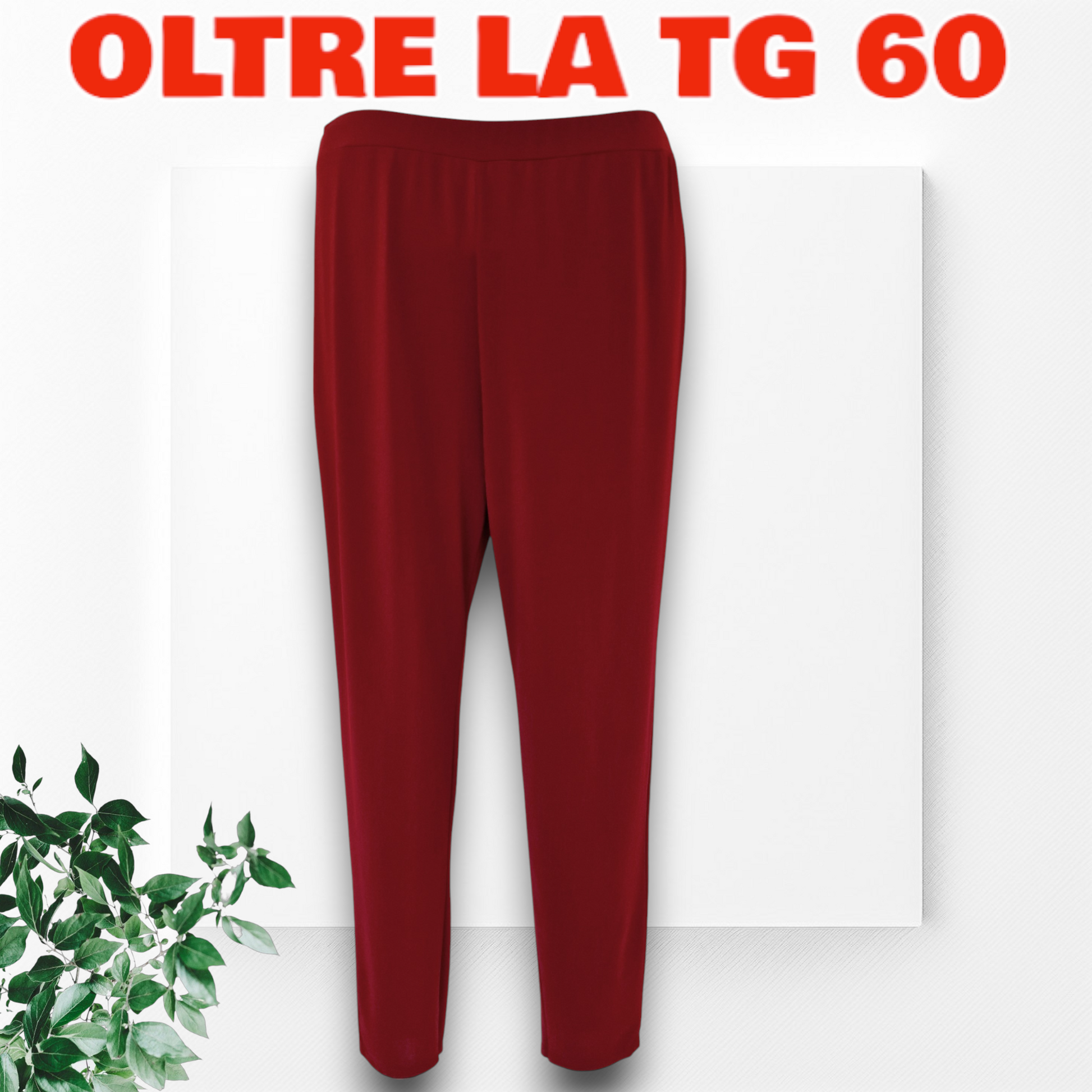 Pantalone Orte è realizzato in crepe di maglina elasticizzata in misto viscosa con elastico in vita. Modello a sigaretta, grandissima vestibilità, taglia unica veste bene fino ad una 62/64. Made in Italy. Colore BORDEAUX.