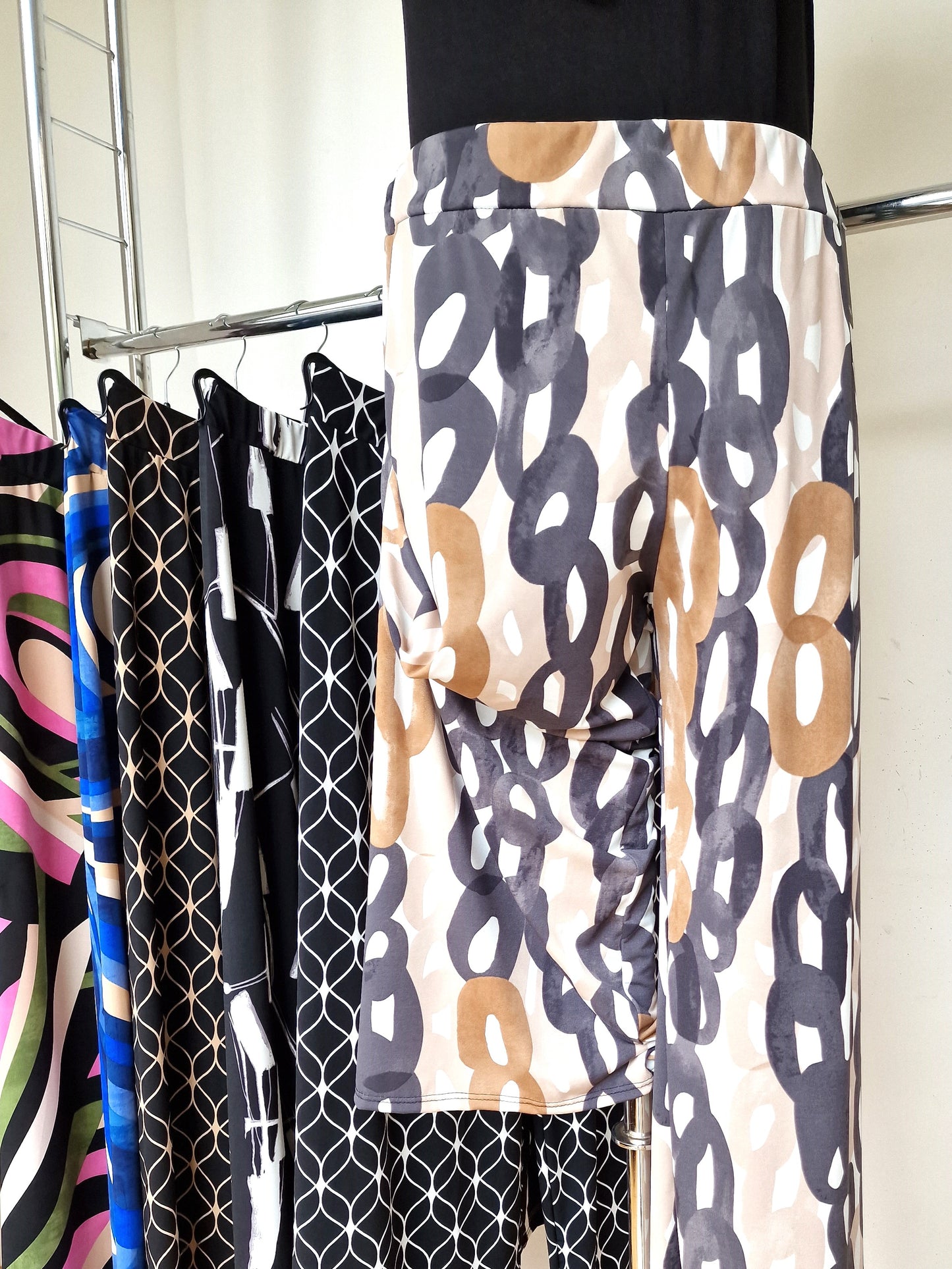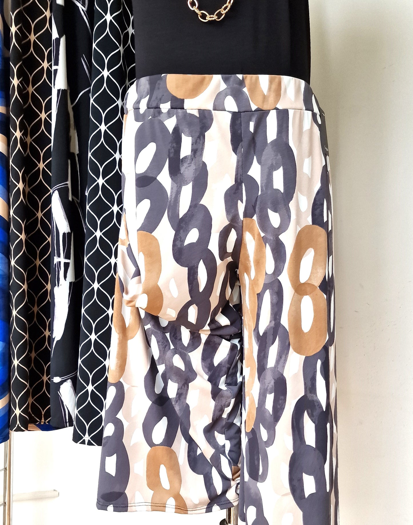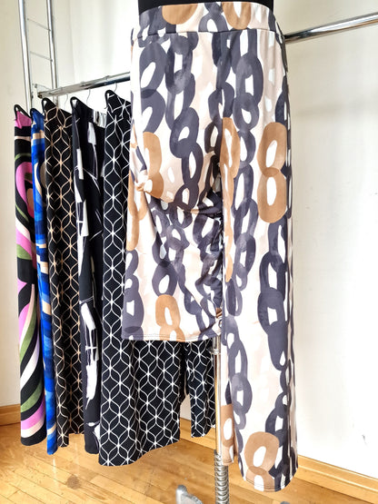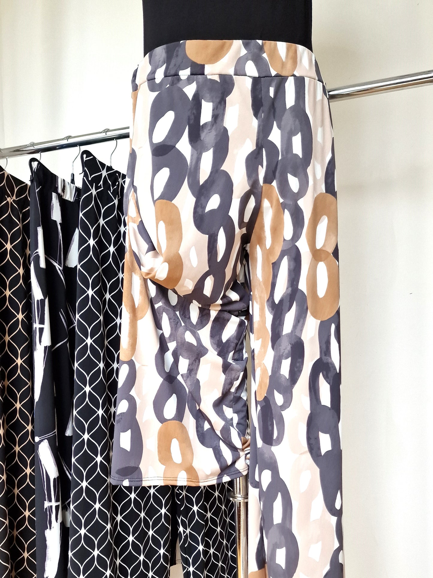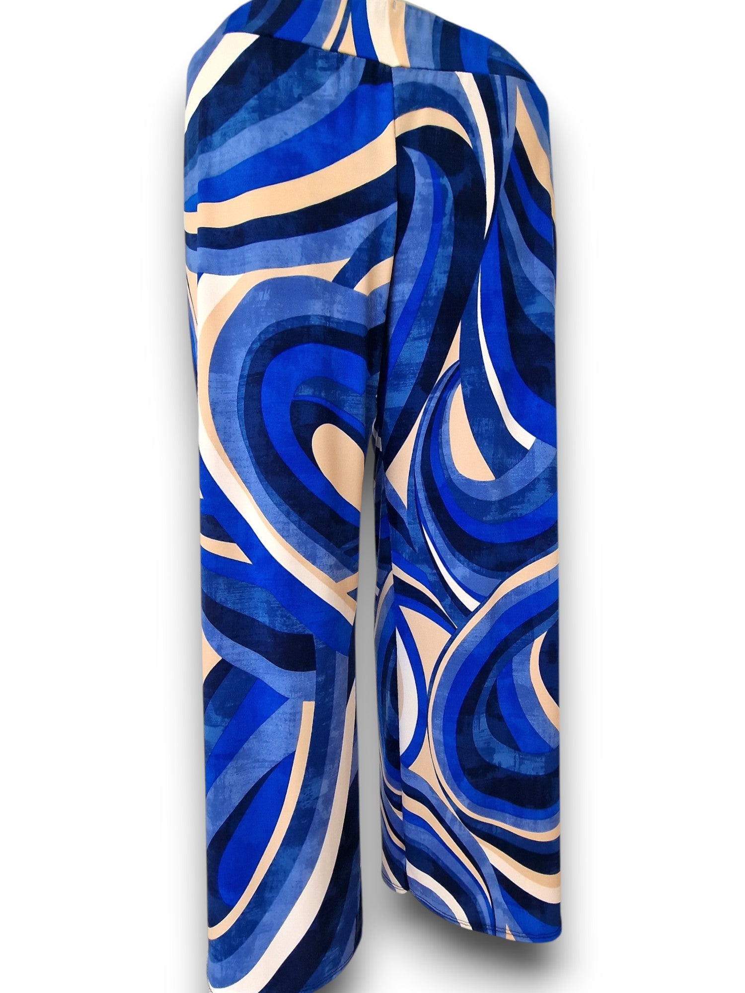 Il modello Castiglioncello è un pantalone a vita alta in crepe di maglina elasticizzata di misto viscosa lucida Fantasia. Modello a palazzo con fascia elastica in vita. Grandissima vestibilità, taglia unica, Made in Italy, veste bene fino ad una taglia 58/60. Colore Fantasia.