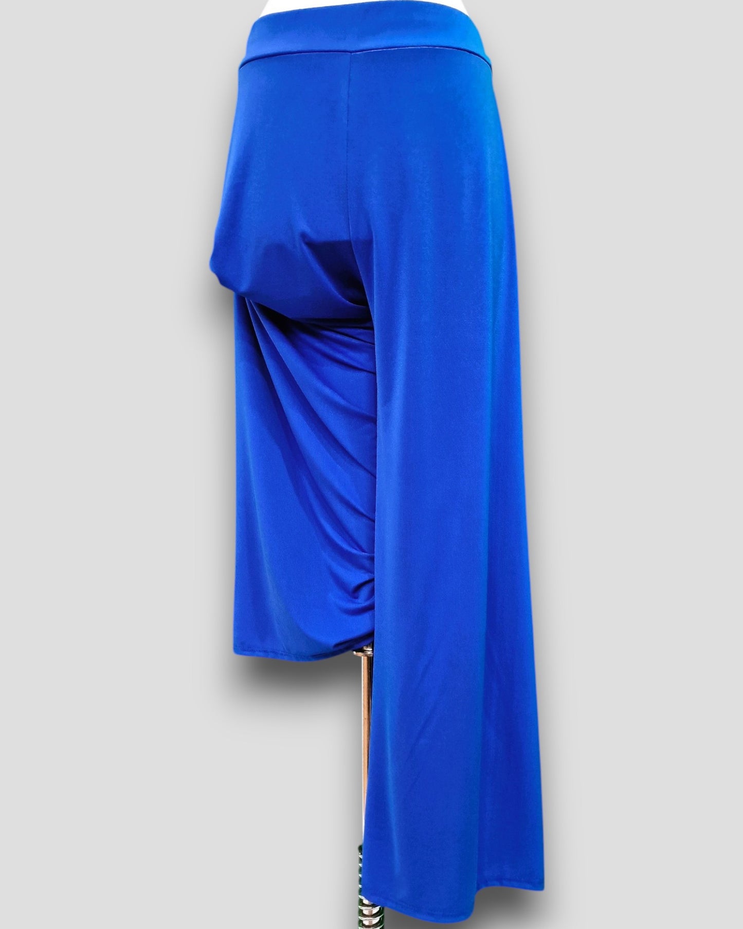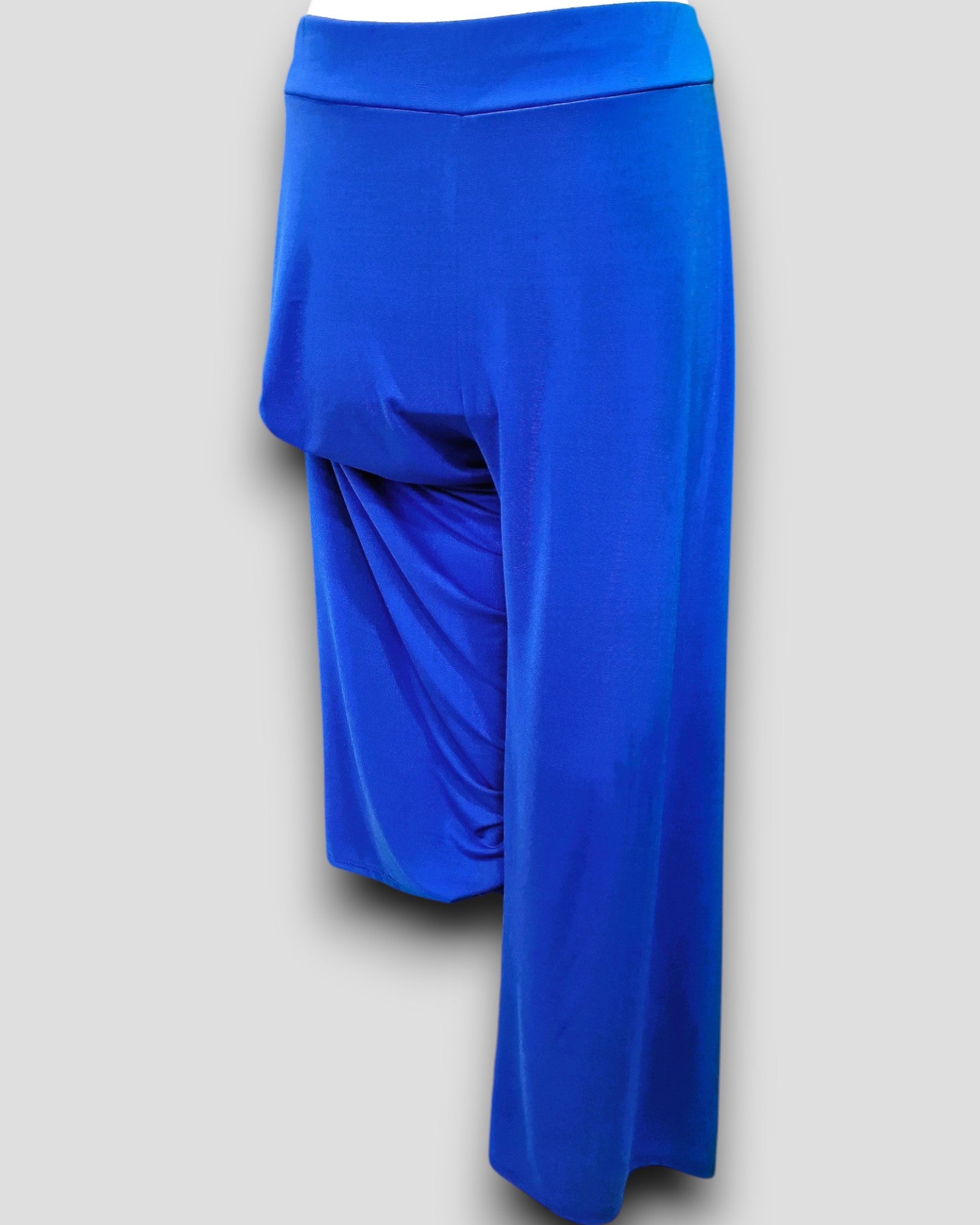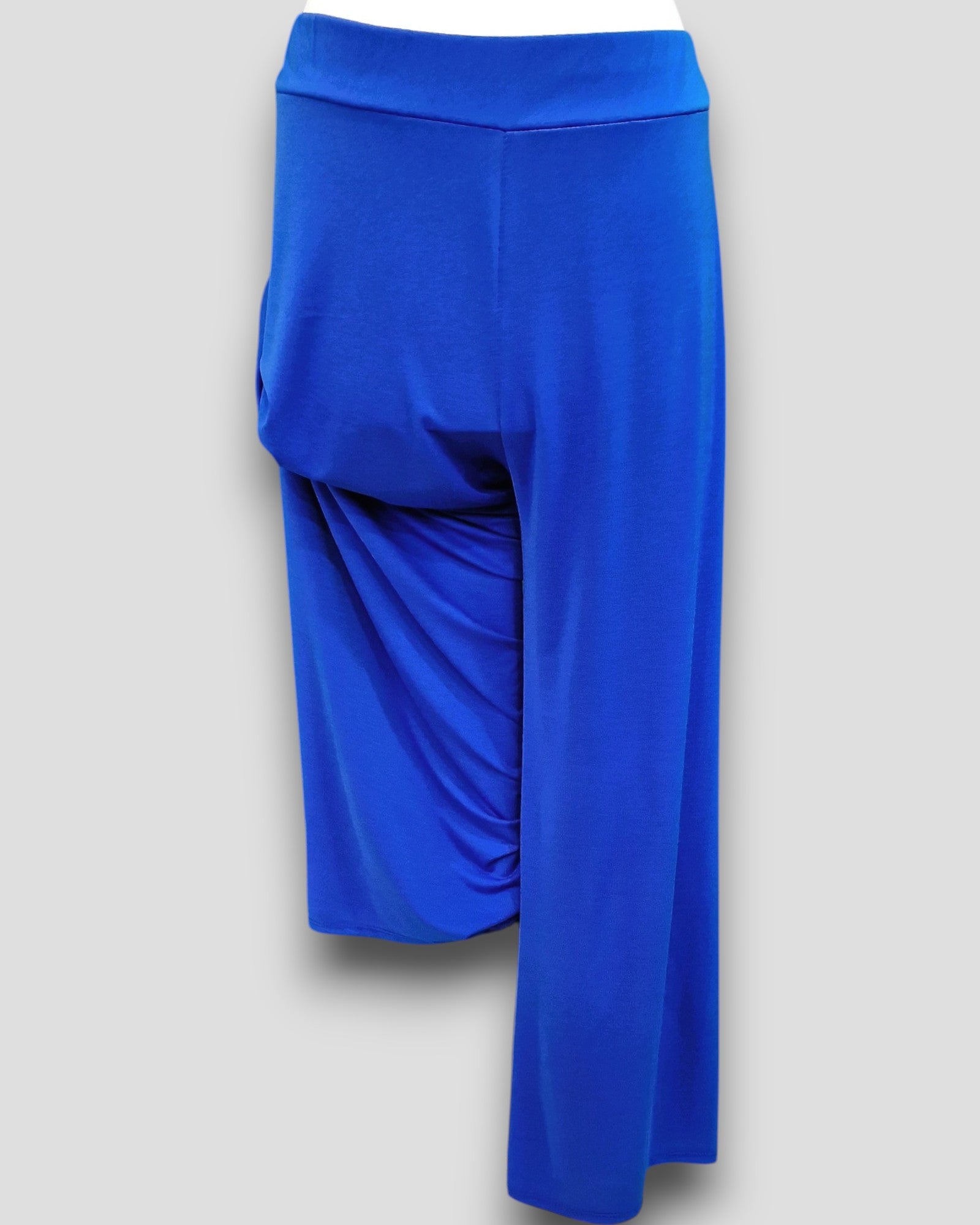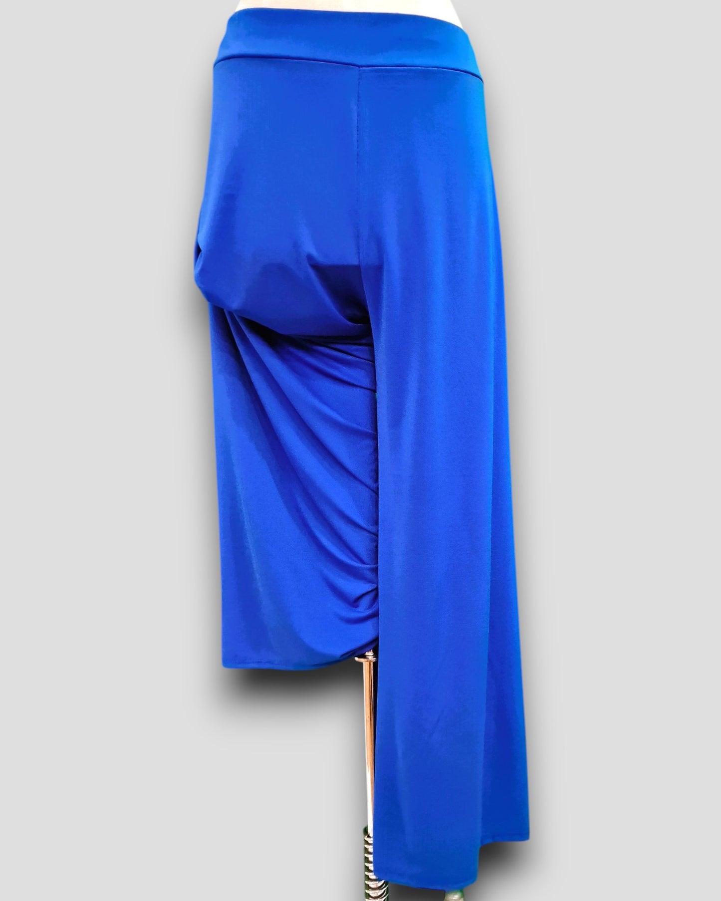 Il modello Albinia è un pantalone a vita alta in crepe di maglina elasticizzata di misto viscosa lucida a palazzo con fascia elastica in vita. Grandissima vestibilità, taglia unica, Made in Italy, veste bene fino ad una taglia 62. Colore BLUETTE.
