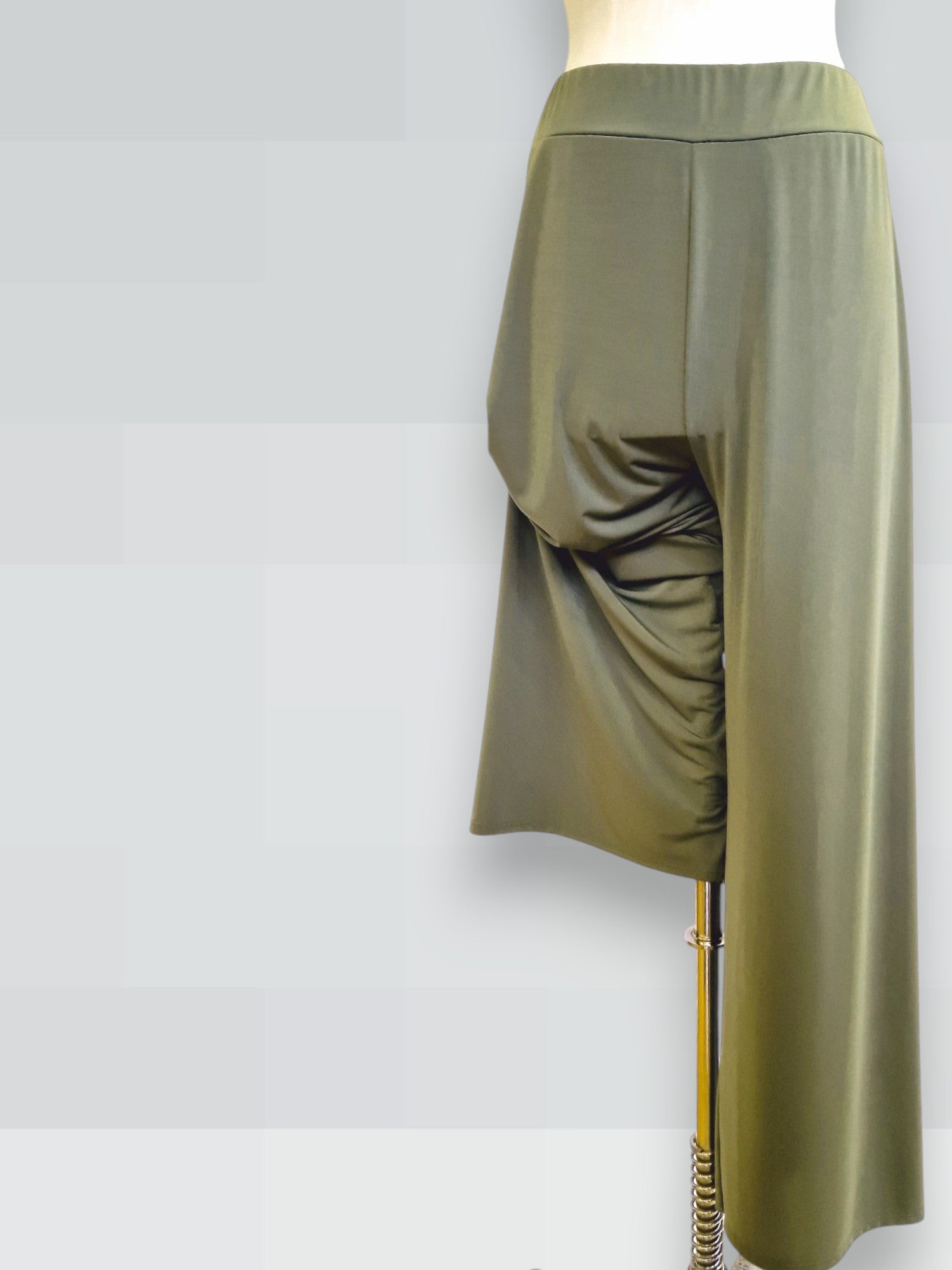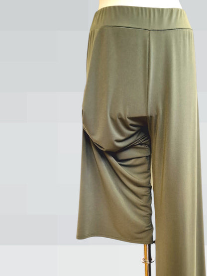 Il modello Formia è un pantalone a vita alta in crepe di maglina elasticizzata di misto viscosa lucida a palazzo con fascia elastica in vita. Grandissima vestibilità, taglia unica, Made in Italy, veste bene fino ad una taglia 62. Colore Verde Militare.
