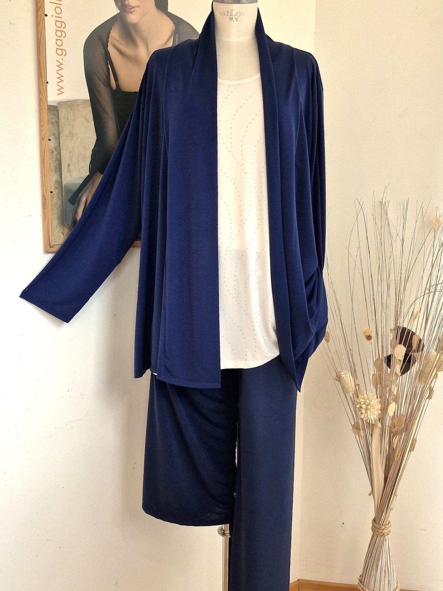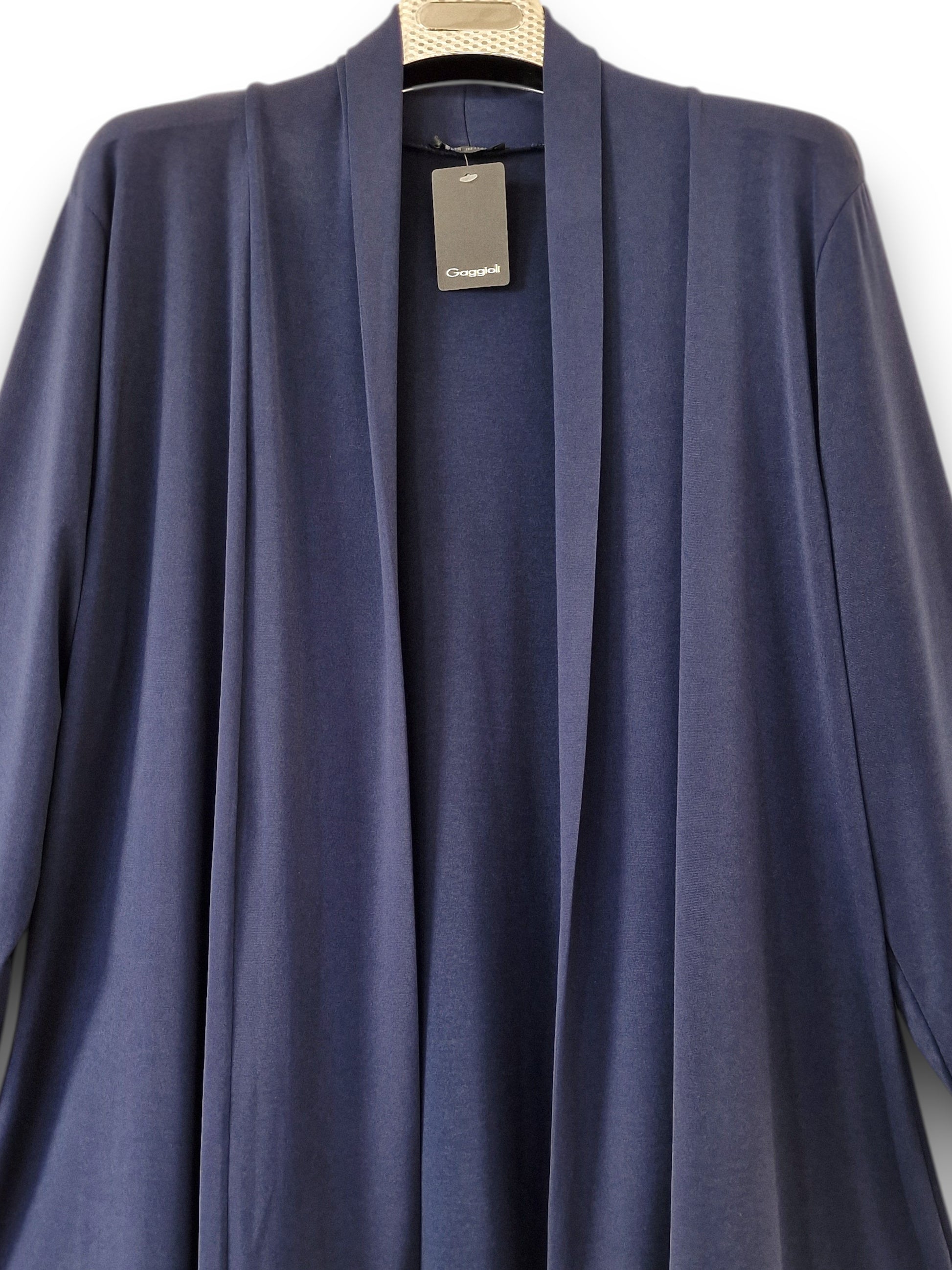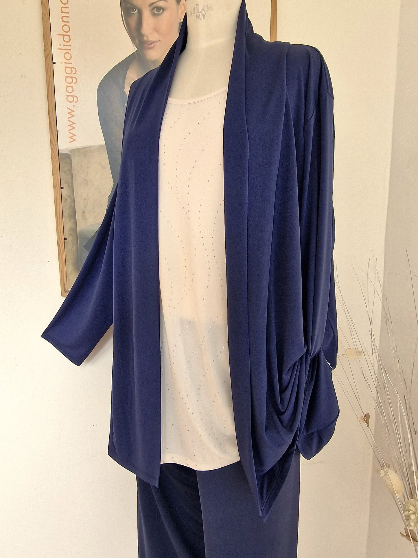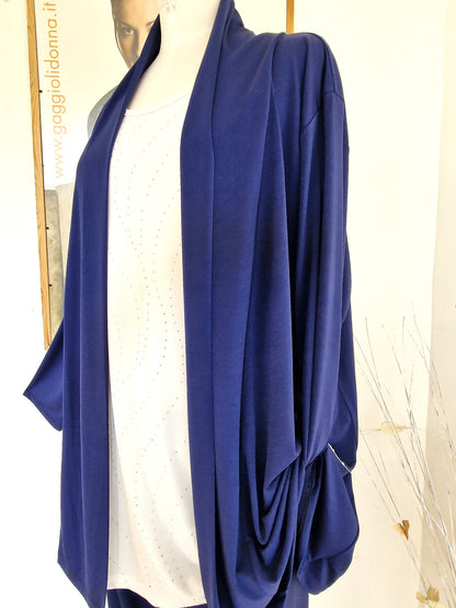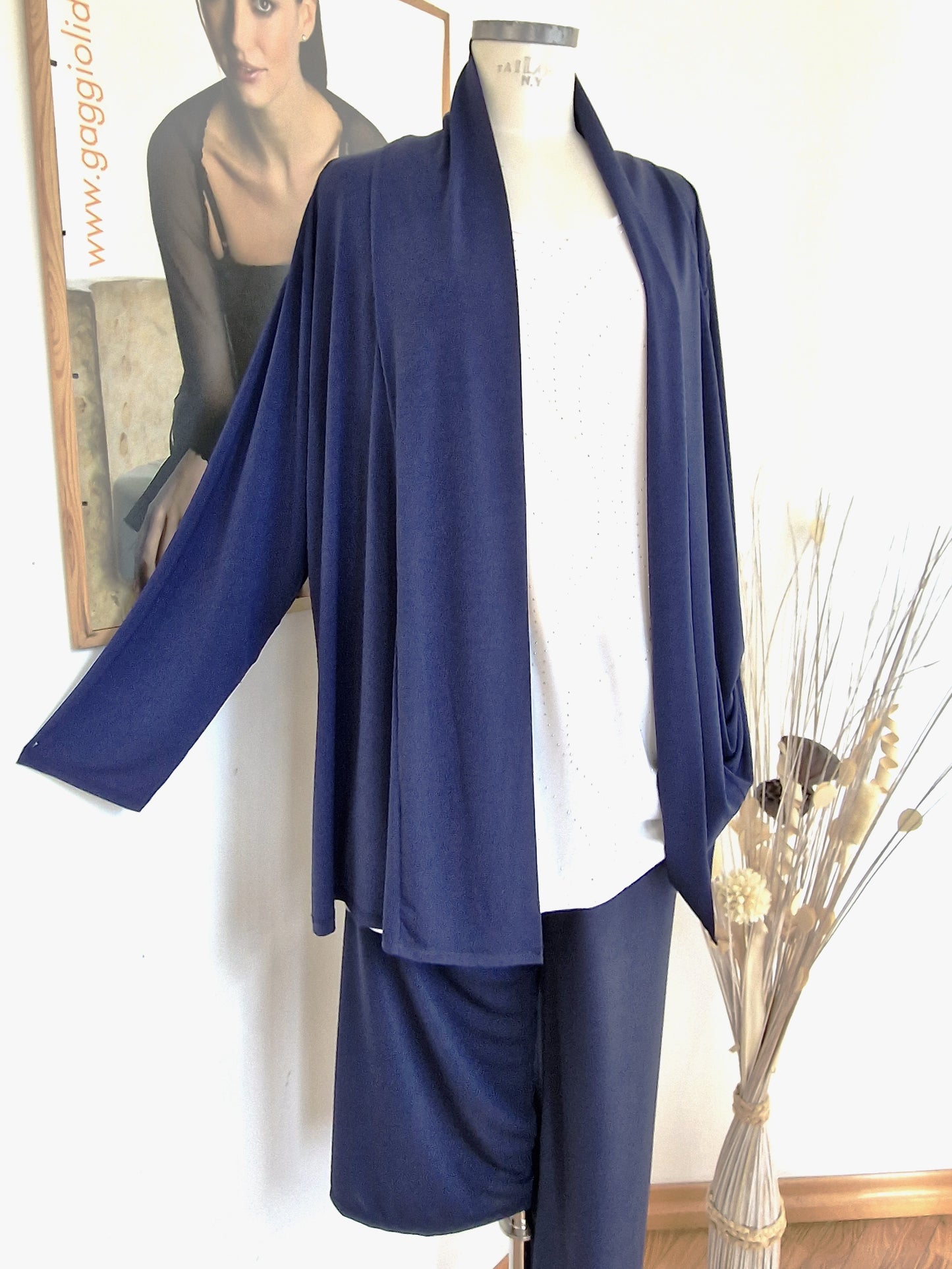 Il modello Nara è uno splendido Spolverino taglia grande in crepe di maglina di misto viscosa elasticizzata con collo sciallato. Grandissima vestibilità, Made in Italy, taglia unica colore BLU.